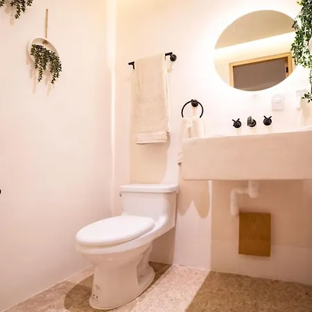 Chic And Elegant Escape In Tulum Apartment includes a balcony and a fully equipped kitchen with air conditioning for utmost comfort. Guests staying in this apartment will enjoy the convenience of a dryer, toiletries, and towels in the bathroom. A separate toilet, a shower, and a washing machine can also be found.